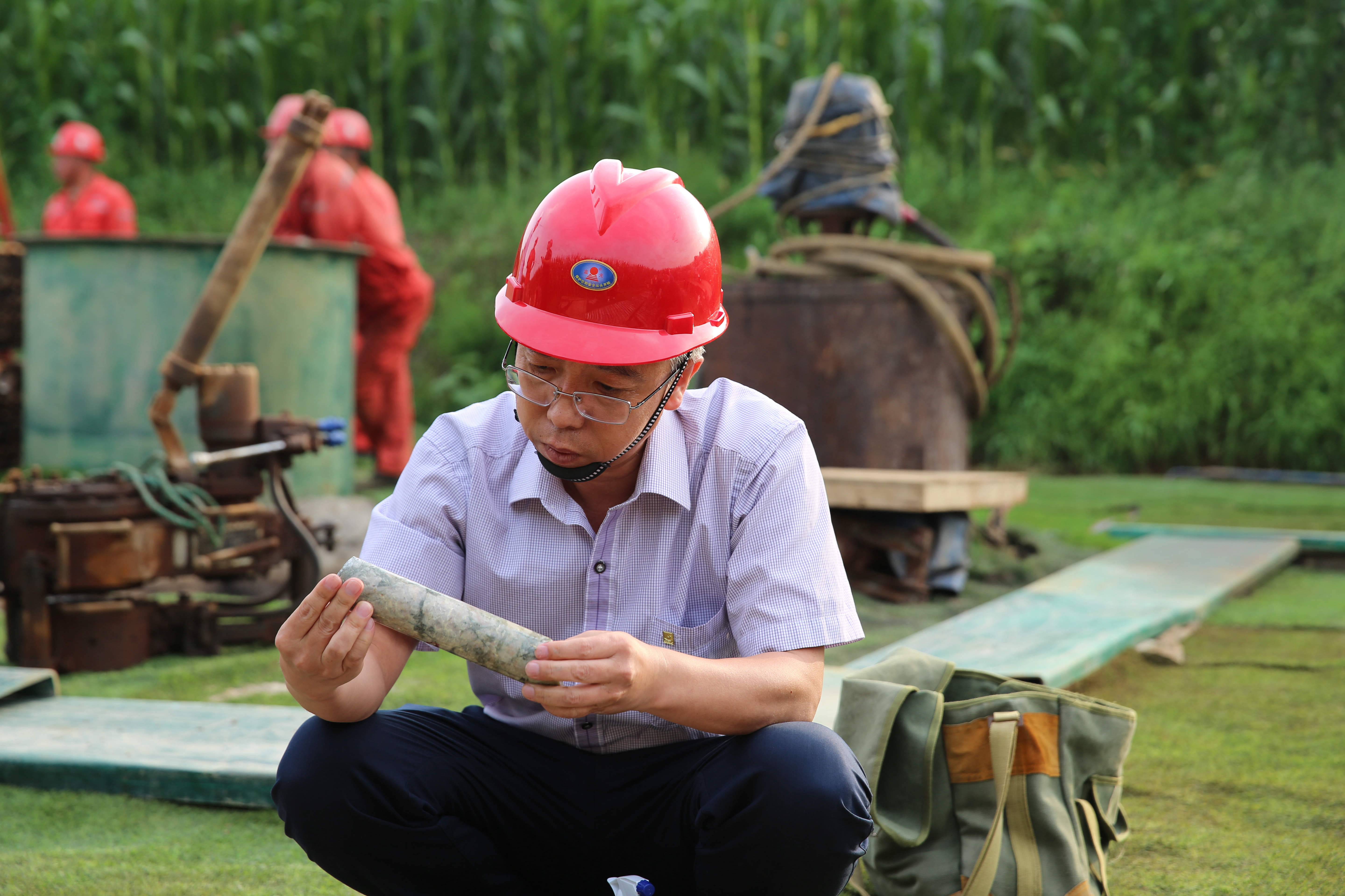 萌山勘查現(xiàn)場第三個(gè)鉆孔,在280米孔深處發(fā)現(xiàn)巖石礦化,這意味著有成礦希望。“你看這個(gè)蝕變,這里已經(jīng)出現(xiàn)黃鐵礦化了,有戲!”馮濤蹲在那箱巖心樣本前,半個(gè)小時(shí)沒“挪窩”,幾縷白發(fā)被風(fēng)吹起,從安全帽下支棱出來,腳底卻紋絲不動(dòng)牢牢“扎了根”。